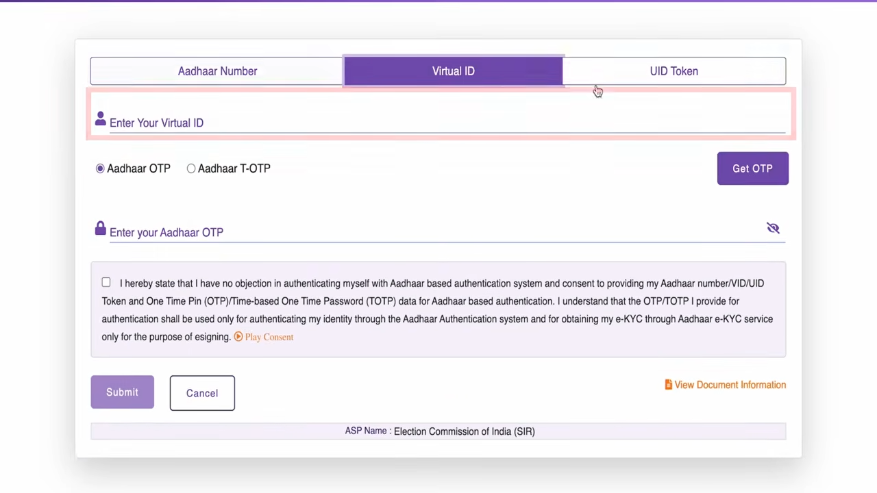 • यहाँ अपना आधार नंबर डालें, ‘Send OTP’ पर क्लिक करें और अपने आधार से लिंक मोबाइल पर आया OTP डालकर सबमिट कर दें।